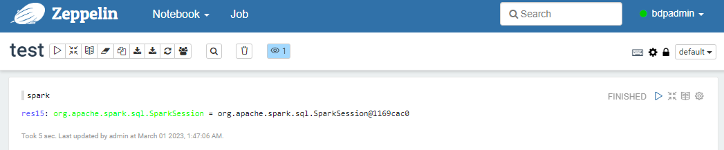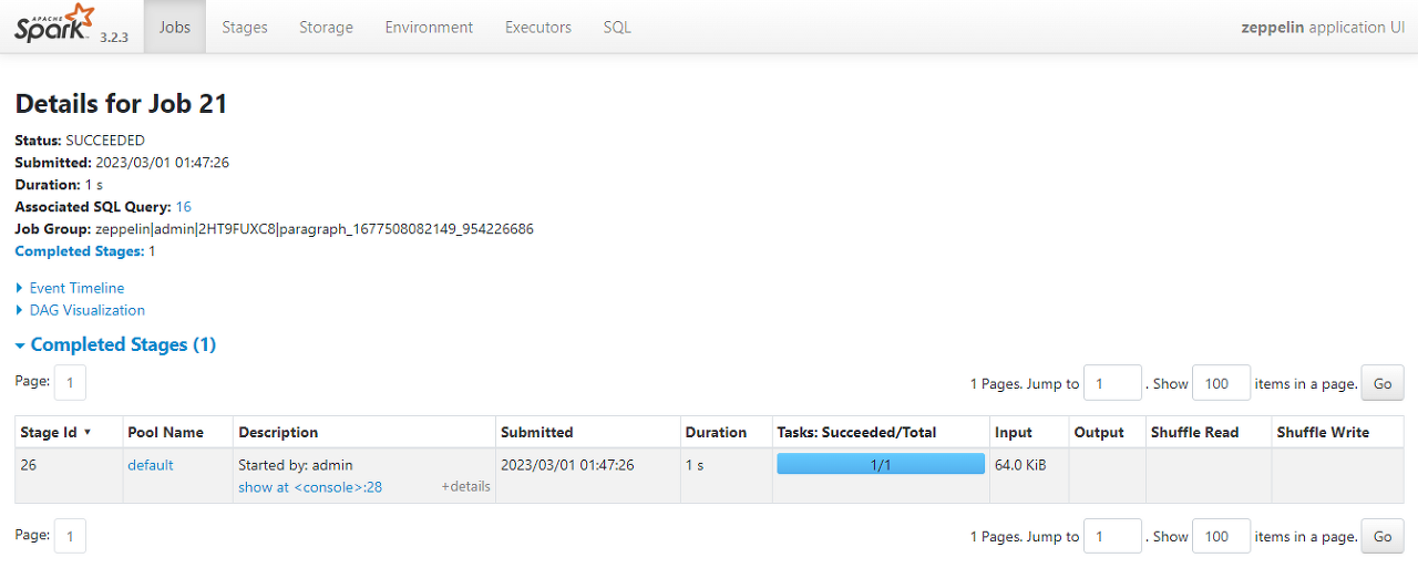 Job Group 항목에 zeppelin에서 admin 권한으로 실행한 작업임을 알 수 있다.