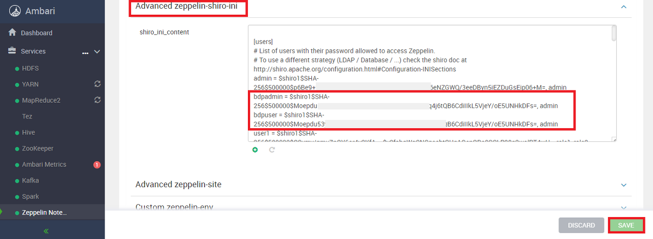 Zepplin의 CONFIGS 화면에서 Advanced zeppelin-shiro-ini를 선택한다.