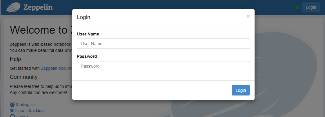 Zeppelin 로그인 창이 나타나면 Zeppelin에 등록한 bdpadmin 계정으로 로그인한다.