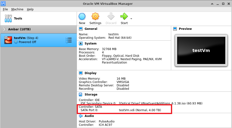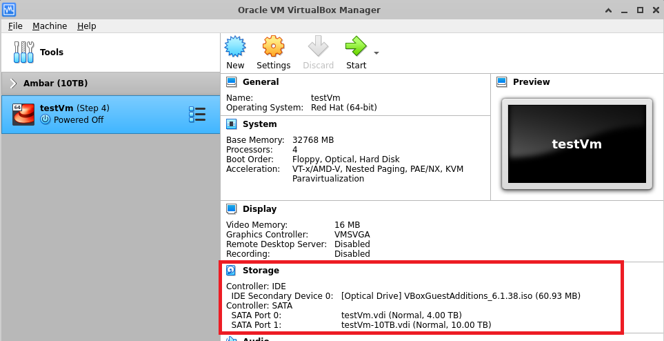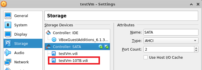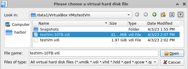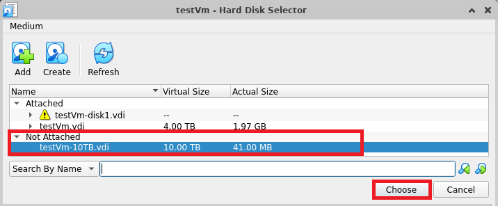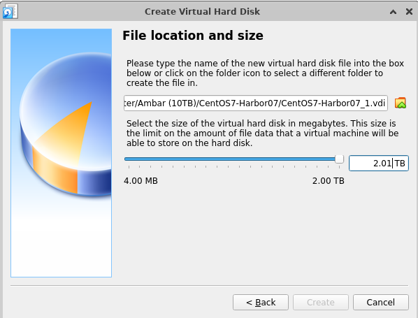 $ vboxmanage createmedium --filename "/data1/VirtualBoxVMs/testVm/testVm-10TB.vdi" --size 10485760 \