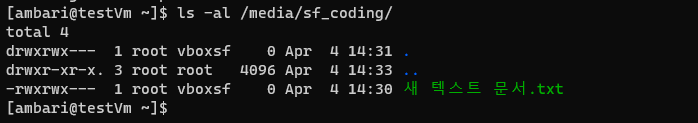 해당 폴더의 권한이 770 (-rwxrwx---)이므로, 사용할 계정을 vboxsf 그룹에 추가하고 로그아웃(또는 재부팅)한다.