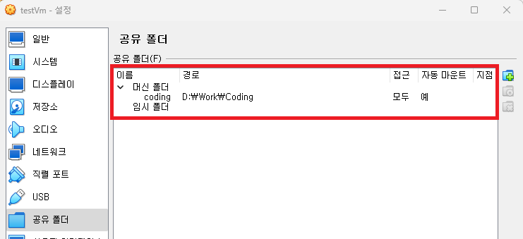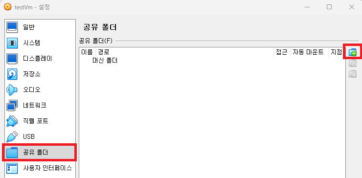 공유 폴더를 설정하기 위해서는 가상환경 설정에서 공유할 폴더를 지정해야 한다.