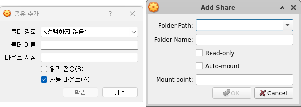 Windows 환경과 Linux 환경의 공유 추가 화면의 배치가 약간 다르다.