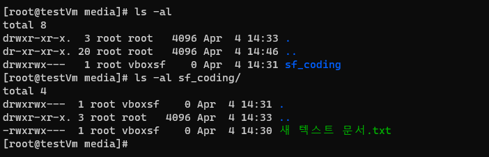 root 계정에 vboxsf 그룹으로 공유되어 있기 때문에 일반 계정은 접근이 불가능하다.