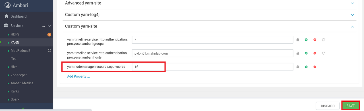 yarn.nodemanager.resource.cpu-vcores 속성을 변경하기 위해 Custom yarn-site 항목에 직접 추가해야 한다.