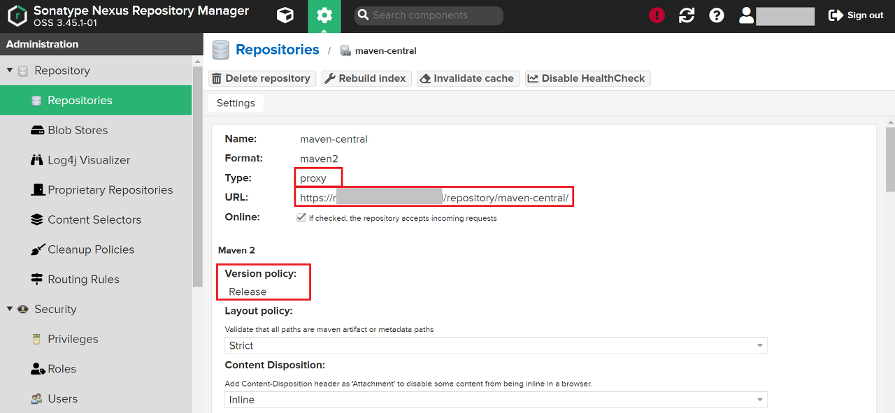 name은 Blob Store와 동일한 maven-apache를 입력하고, Version policy는 Release를 유지한다.