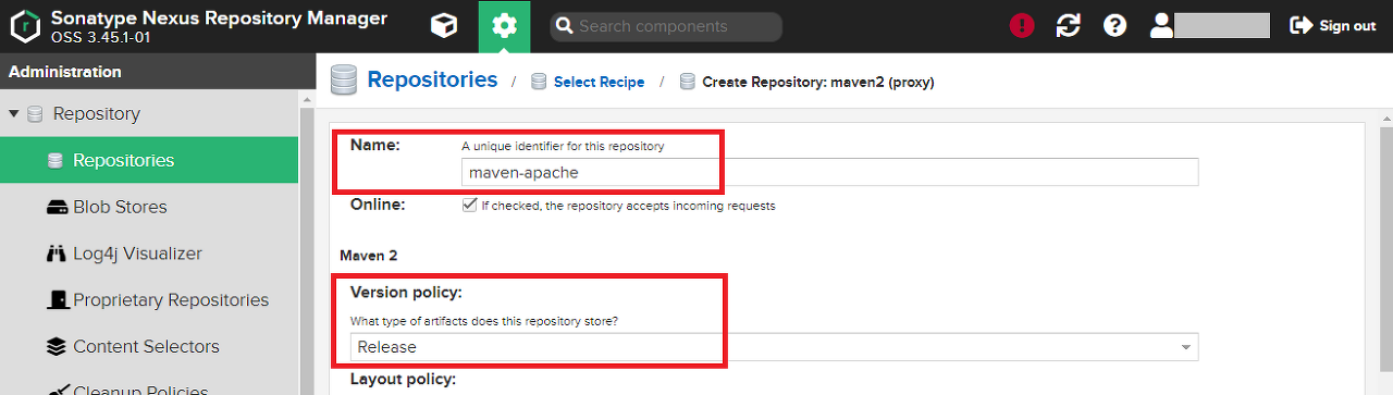 name은 Blob Store와 동일한 maven-apache를 입력하고, Version policy는 Release를 유지한다.