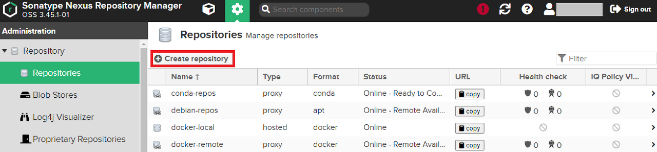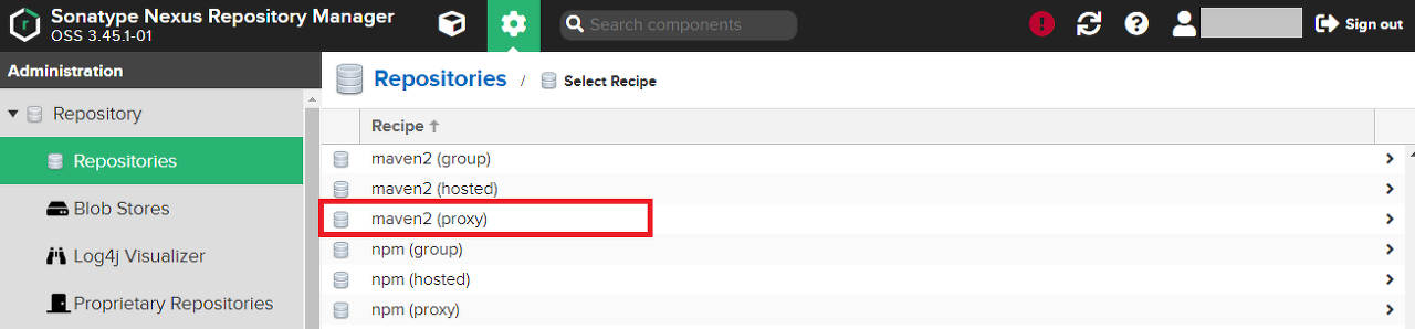 Nexus에 관리자 계정으로 접속하고, Nexus 환경 설정 - Repository - Repositories를 클릭한다.