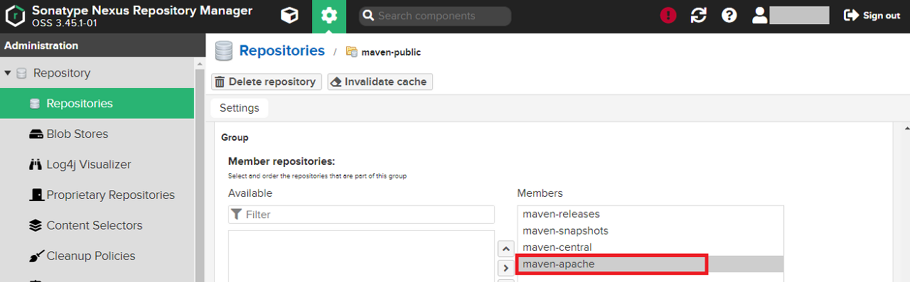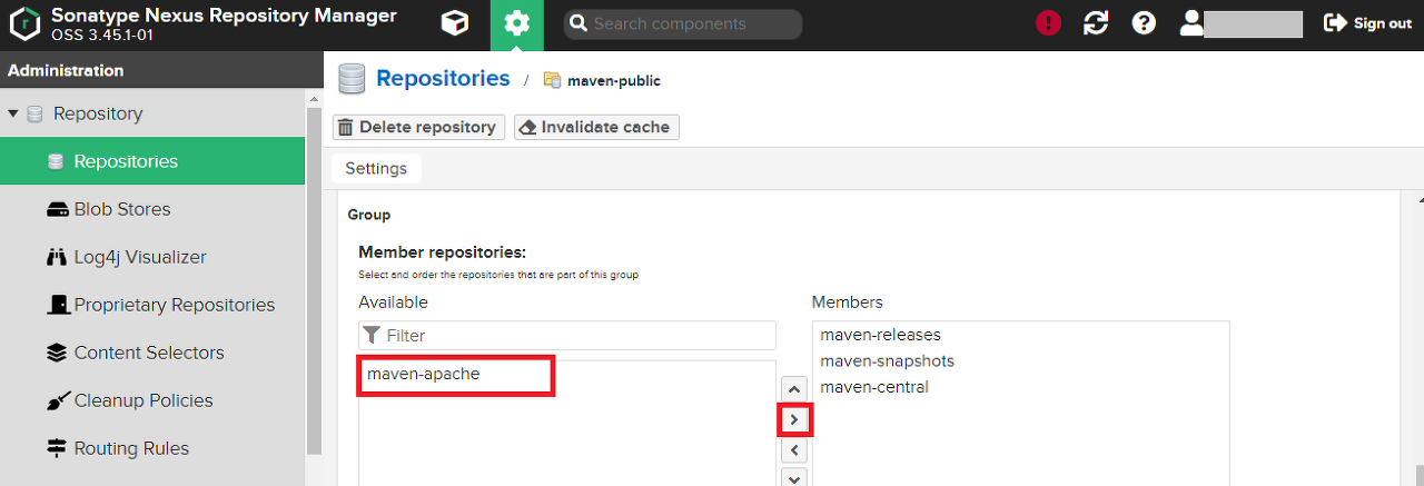 maven-apache 저장소를 Members 항목으로 이동하고 Save를 클릭한다.