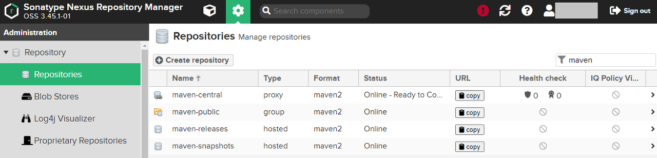 Nexus를 설치하면 기본으로 제공하는 저장소이며, 아래 순서로 저장소의 확인을 진행한다.