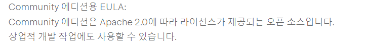 커뮤니티 에디션(Community Edition)은 Apache 2.0 라이선스를 따르기에 회사에서 사용 가능하다. (Pycharm도 동일)