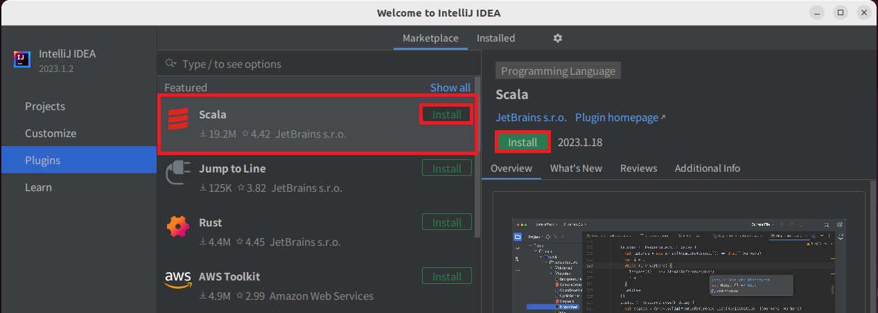 Scala를 선택하고 Install 버튼을 클릭하여 설치를 진행한다.