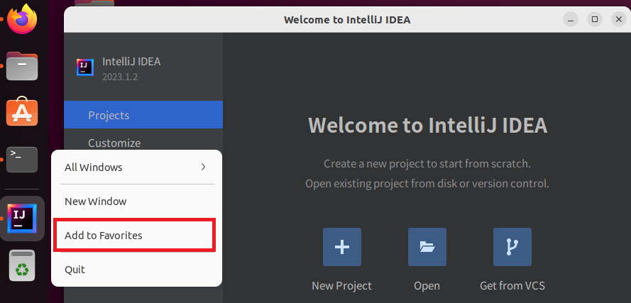 작업 표시줄의 IntelliJ 아이콘을 우클릭하면 Add to Favorites에 설정할 수 있다.