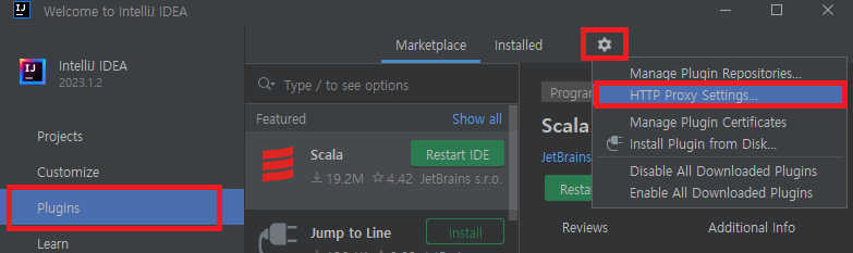 초기 화면에서 Plugins를 선택하고 우측 상단의 톱니 바퀴를 클릭한다.