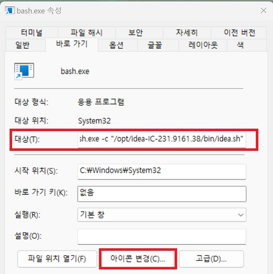 아이콘 변경을 클릭하고 아래 파일을 선택한다.