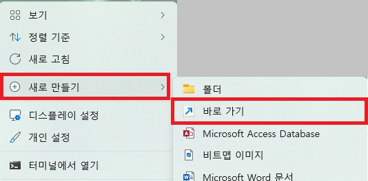 윈도우 바탕화면에서 우클릭하고 새로 만들기에서 바로가기 메뉴를 클릭한다.
