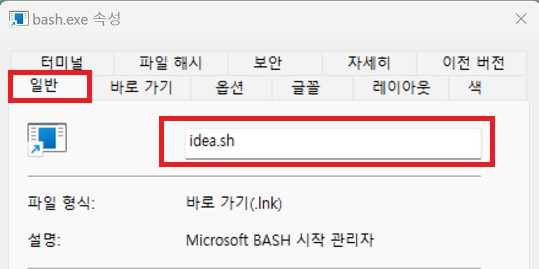 일반 탭에서 파일명을 idea.sh 로 변경한다. 또는 IntelliJ 등 사용하고자 하는 파일명으로 변경한다.
