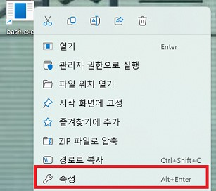 해당 아이콘을 우클릭하고 속성 메뉴를 클릭한다.