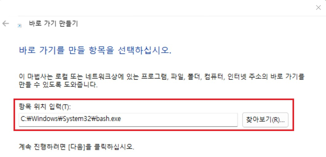 WSL의 bash를 통해 실행할 것이므로 항목 위치 입력 부분에는 bash.exe의 경로를 입력한다.