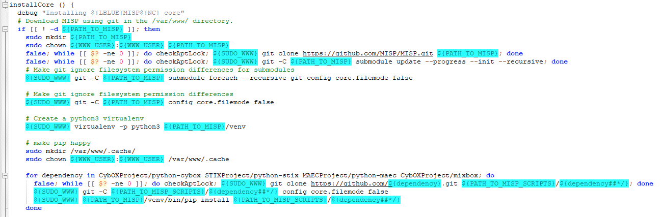 | github 접근이 차단 된 경우 진행 불가 GitHub 접근이 불가능하거나, git clone 명령을 사용하는 것을 차단한 환경에서는 해당 Docker 이미지 빌드가 불가능하다. MISP 설치 스크립트를 살펴보면 다음과 같이 git clone이 다수 사용된 것을 확인할 수 있다. 따라서 Private Repository를 활용한 Docker 베이스 이미지를 가져오는 것은 가능하지만, MISP 설치 스크립트에 포함된 git clone 명령이 응답 없음 처리가 되므로 Docker 이미지 생성이 불가능하다. ![]() |