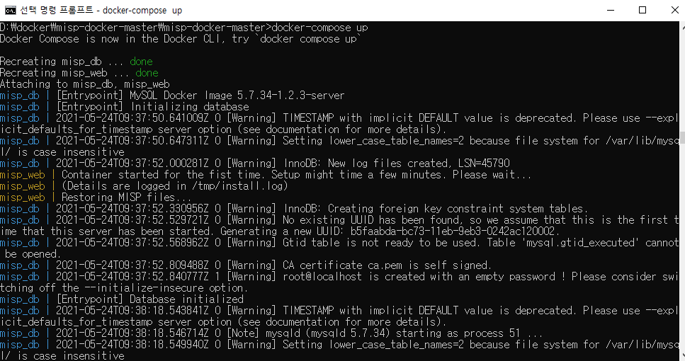 처음 실행한 경우 db 테이블과 MISP 코드를 초기화 하는 과정이 진행되어 약 2~3분간 기다려야 한다.