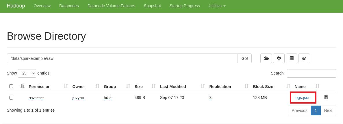 SparkExample 패키지의 테스트 데이터로 활용했던, logs.json 파일을 HDFS에 업로드한다.