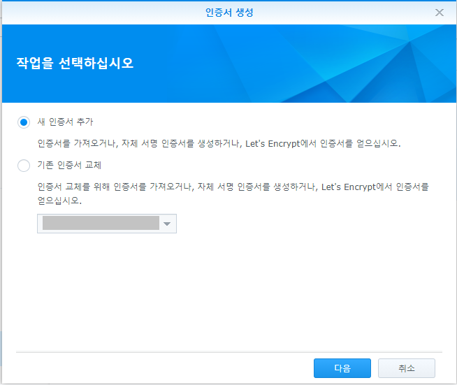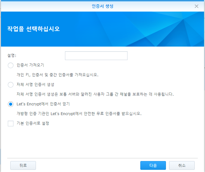 일단 첫번째 단계인 시놀로지 NAS에서 Let's Encrypt 인증서를 발급 받는 방법은 다음과 같다.