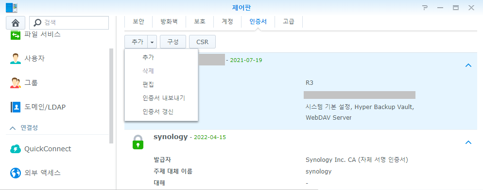 정상적으로 인증서가 발급 되면 시놀로지 DSM에서 제어판 - 보안 - 인증서 탭에 추가된다.