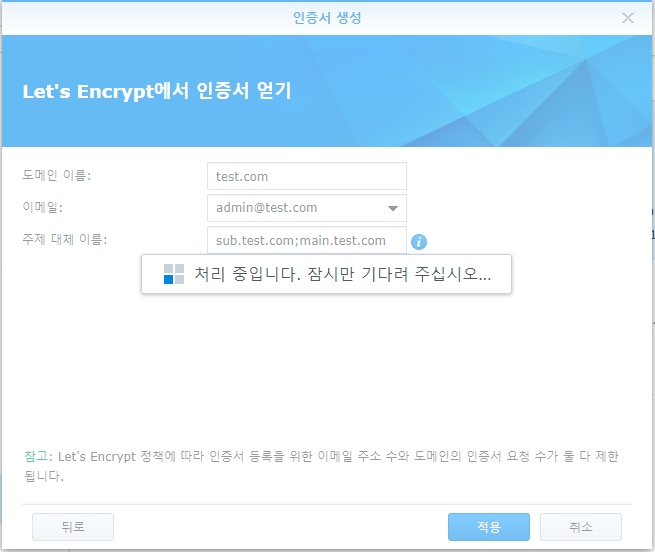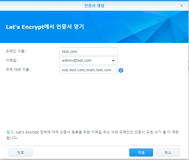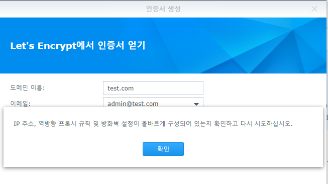- Let's Encrypt는 특정 상위 도메인 (ex. synology.me)이 10분간 5회 이상 재발급을 받으면 1주간 발급이 불가능하다.