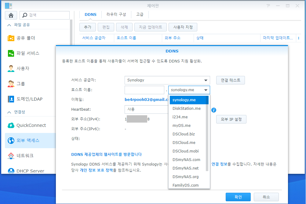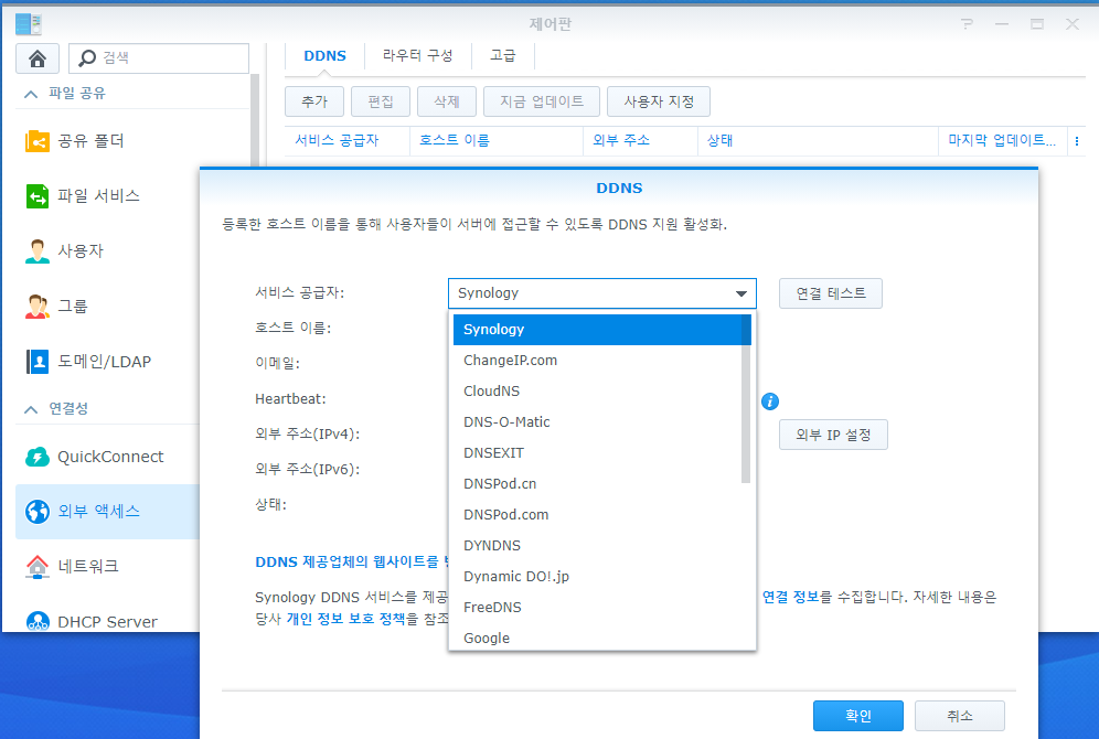 시놀로지 DSM에서 제어판 - 외부 액세스 - DDNS로 이동하면 다음과 같은 화면을 확인할 수 있다.