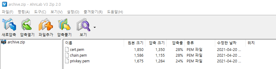 archive.zip이 다운로드 되고, cert.pem, chain.pem, privkey.pem 총 3개 파일이 포함되어 있다.