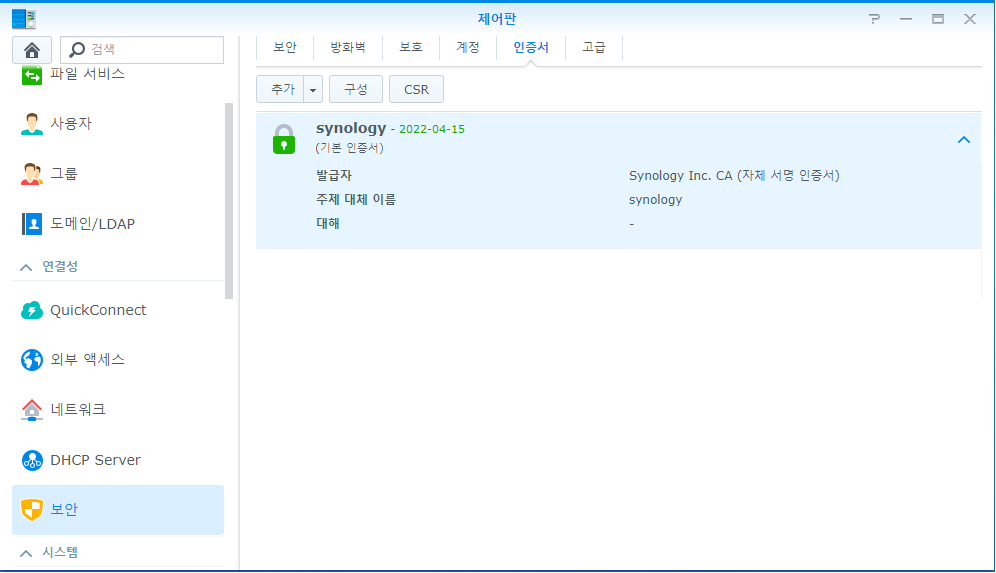 기본 설정 된 인증서가 존재하는데 시놀로지가 자체적으로 발급한 사설 인증서이다. (발급자 항목에 '자체 서명 인증서'라고 되어 있다.)