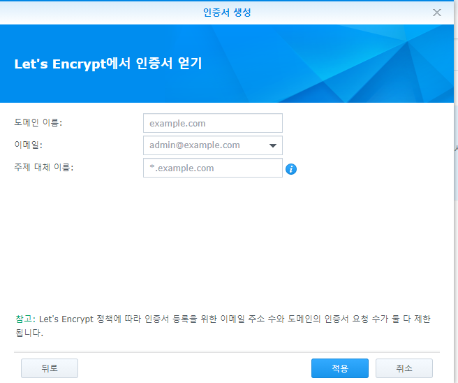 DDNS를 통해 제공 받는 무료 도메인 중 사용자가 많이 몰리는 주소는 Let's Encrypt 인증서 발급 받기 어려울 수 있다. (iptime.org, synology.me 등)
