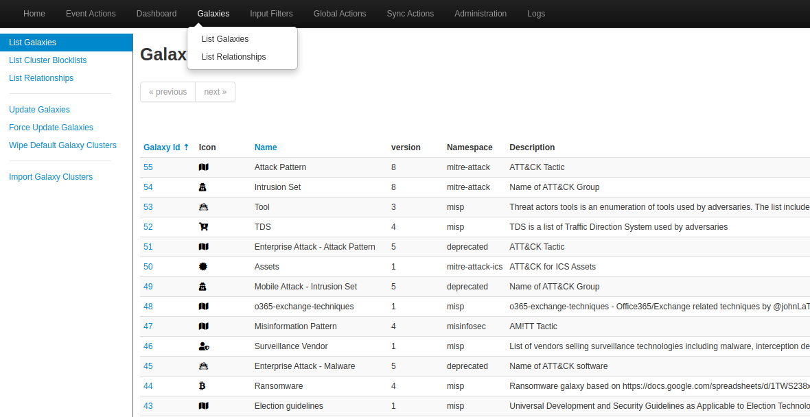 Galaxies → List Galaxies → Update Galaxies