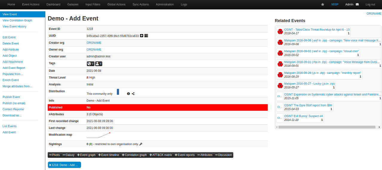 2021.06.09 - [::: 정보보안 :::] - MISP 사용해보기 1 - 기본 설정과 이벤트 추가의 4.1. 새로운 Event 추가 내용을 참고한다.