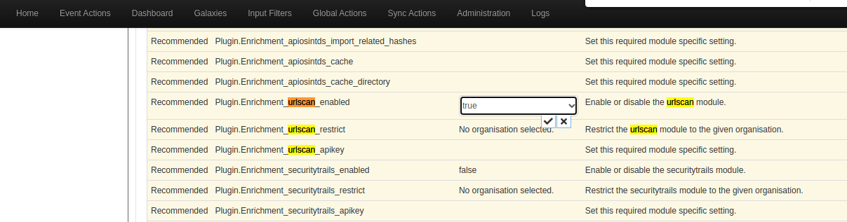 예제에서는 DNS enabled, ipsan_enabled, macvendors_enabled, urlscan_enabled를 True로 변경한다.