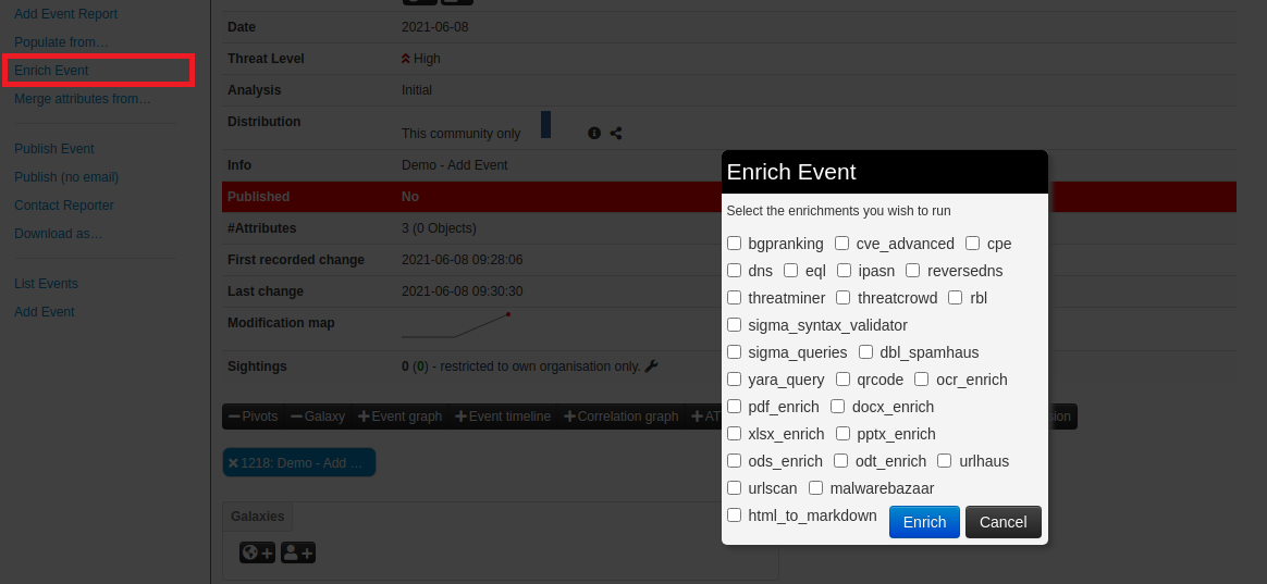 Event Actions → 필요한 항목 선택 후 Enrich를 클릭한다.