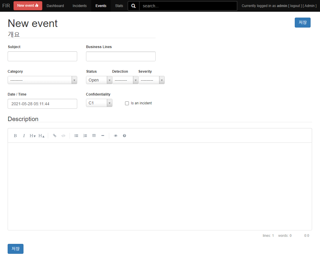 FIR은 Incident - Event로 구성되는데, Is an incident 누르면 Incident로 생성 가능하다.