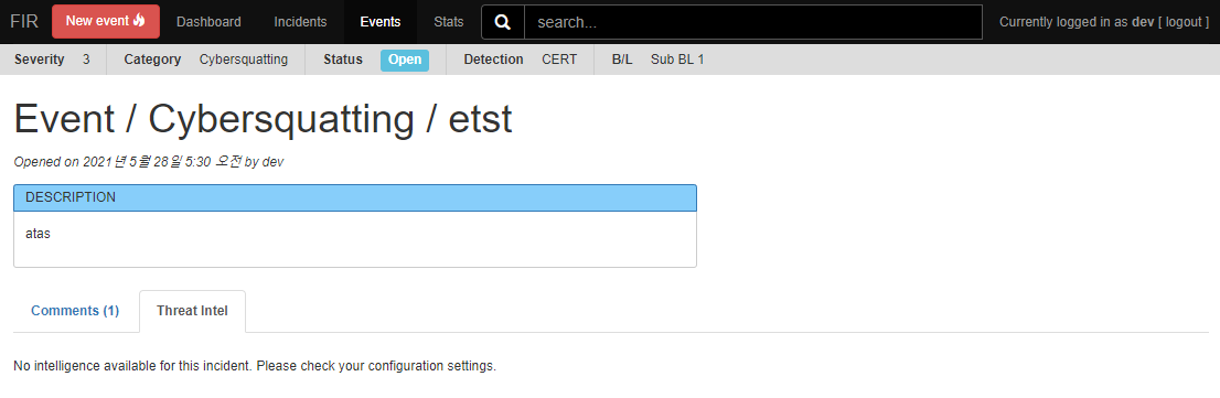 Event 또는 Incident를 생성하면 세부 사항에 Comment와 Theat Intel 탭이 있다.