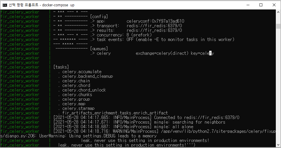 터미널을 실행하고 압축을 해제한 경로 하위의 docker 폴더로 이동하고 docker-compose up을 실행하면 정상적으로 실행된다.