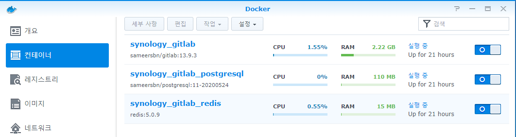 시놀로지 Docker를 실행하고 컨테이너 탭의 synology_gitlab을 선택한다.