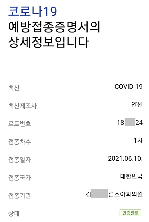 저도 해당 앱을 설치하고 인증 받았고, 다음과 같이 접종 이력이 확인됩니다.