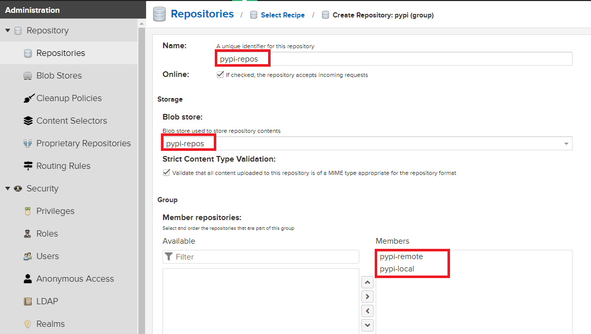 - Blob store - 기존에 생성한 저장소를 선택한다. proxy (group) 저장소이므로 pypi-repos를 선택한다.