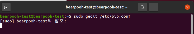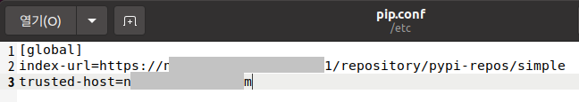 /etc/pip.conf 파일을 수정한다. /etc 경로이기 때문에 관리자 권한이 필요하여 sudo를 사용한다.