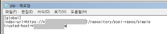 pip.ini 파일 내용을 작성한다. 내용은 리눅스의 pip.conf와 동일하다.