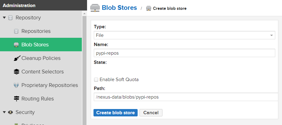- Blob store - 기존에 생성한 저장소를 선택한다. hosted (Local) 저장소이므로 pypi-local을 선택한다.