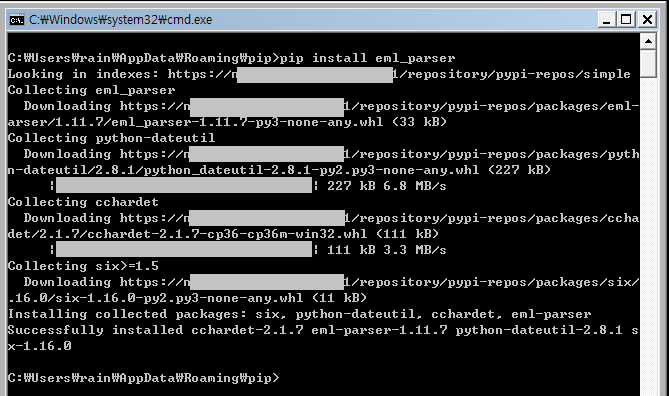 pip.ini 파일 생성 후 임의의 python 패키지를 설치하면 해당 저장소를 통해 다운로드 하는 것을 확인할 수 있다. (eml_parser 설치)