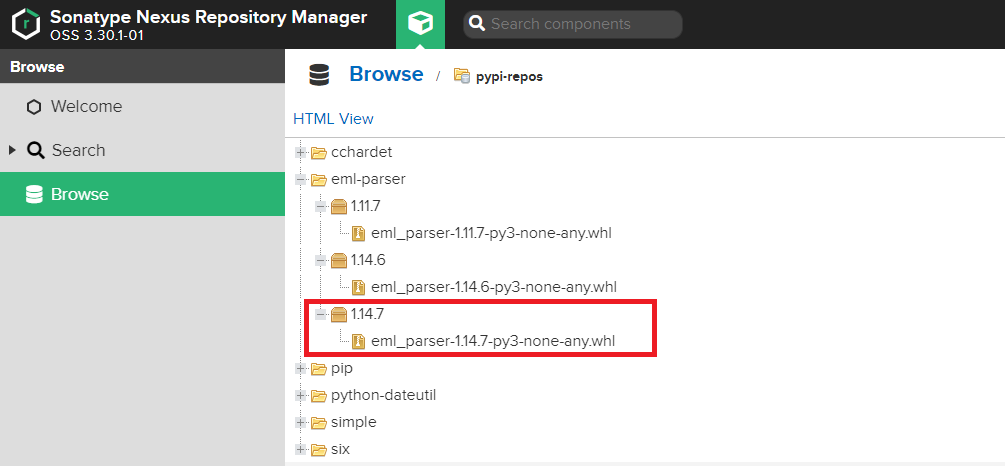 eml_parser는 1.14.7 버전이 설치되었고, 실제 pypi-repos 경로에 해당 버전이 존재하는 것을 확인할 수 있다.
