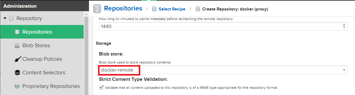 - Blob store - 기존에 생성한 저장소를 선택한다. proxy (Remote) 저장소이므로 docker-remote를 선택한다.
