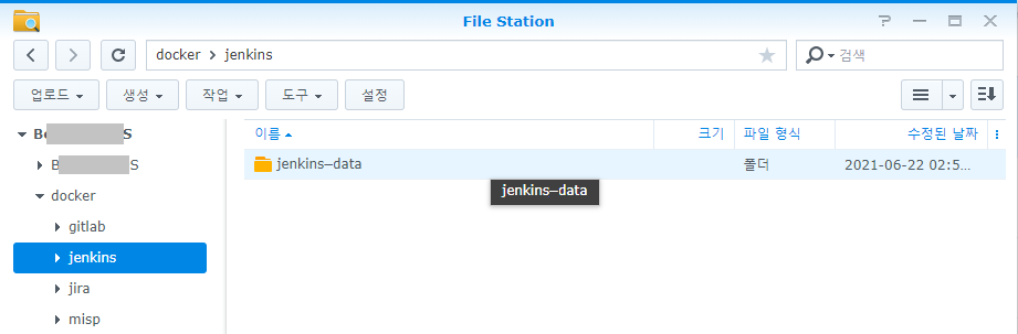 - docker 폴더 하위에 jenkins 폴더를 만들고, 실제 데이터가 저장 될 jenkins-data 폴더를 생성했다.